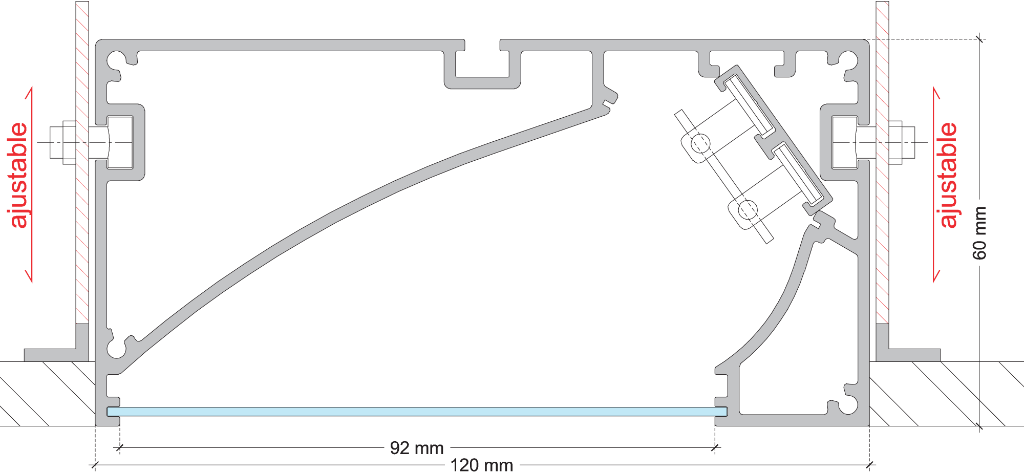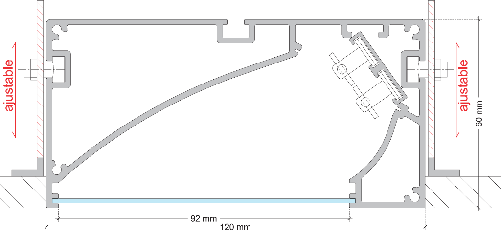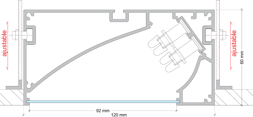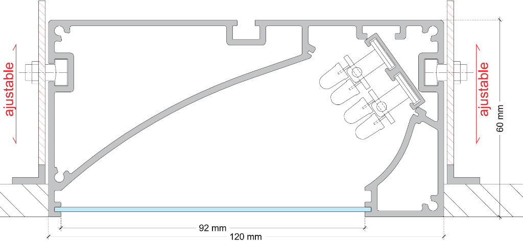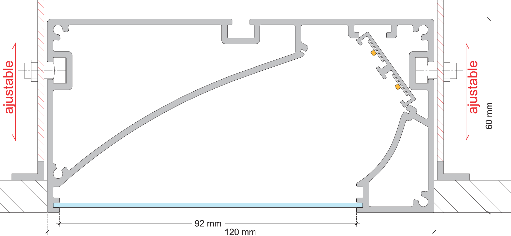 Natural anodised aluminuim wall-washer profile with 24° asymmetric reflector rendering an evenly diffused light.